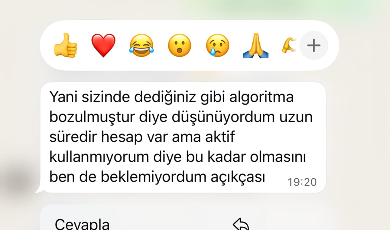 "Hesapta izlenme alamıyordum, algoritma bozulmuştur diye düşünüyordum aslında. Uzun süredir bu hesabım açık ama aktif kullanmadığım için izlenmiyorum diye düşünüyordum. Şimdi yeni videoları atınca bu kadar izlenmesini kesinlikle beklemiyordum açıkçası :)"